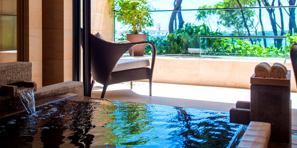 20の客室すべてに露天風呂があり、好きな時間に湯浴みを楽しめます。さらに館内には3つの貸切露天風呂も完備。それぞれに異なるテーマを設けた露天風呂となっており、自社源泉である伊勢志摩賢島温泉の泉質は、肌に優しく保温・保湿効果が抜群です。