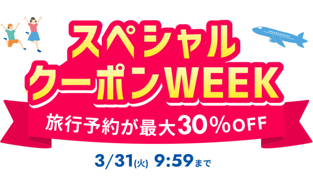 CHECK!【楽天トラベル|スペシャルクーポンWEEK】国内宿泊、楽パック(交通+宿)、遊び・体験の予約がクーポンで最大30%OFFに!3/31(火)9:59まで!