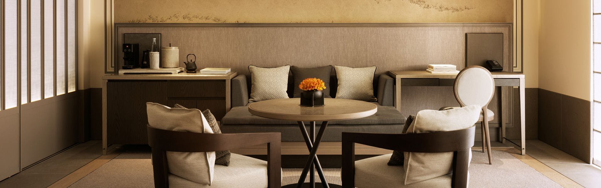 伝統的な日本の住居からインスピレーションを得てデザインされた館内は、和の素材をラグジュアリーに配した空間となっており、客室の大きな窓からは一面に広がるパノラミックな東京の景色を眺めることができます。